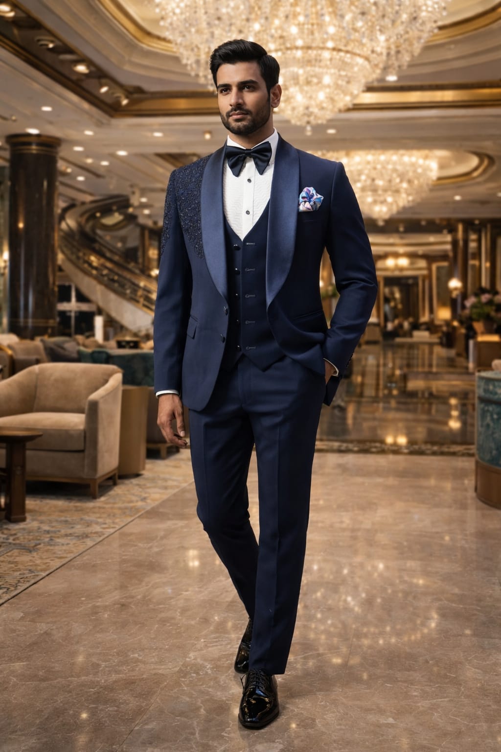 A refined navy blue tuxedo set with satin detailing and a sharp tailored fit