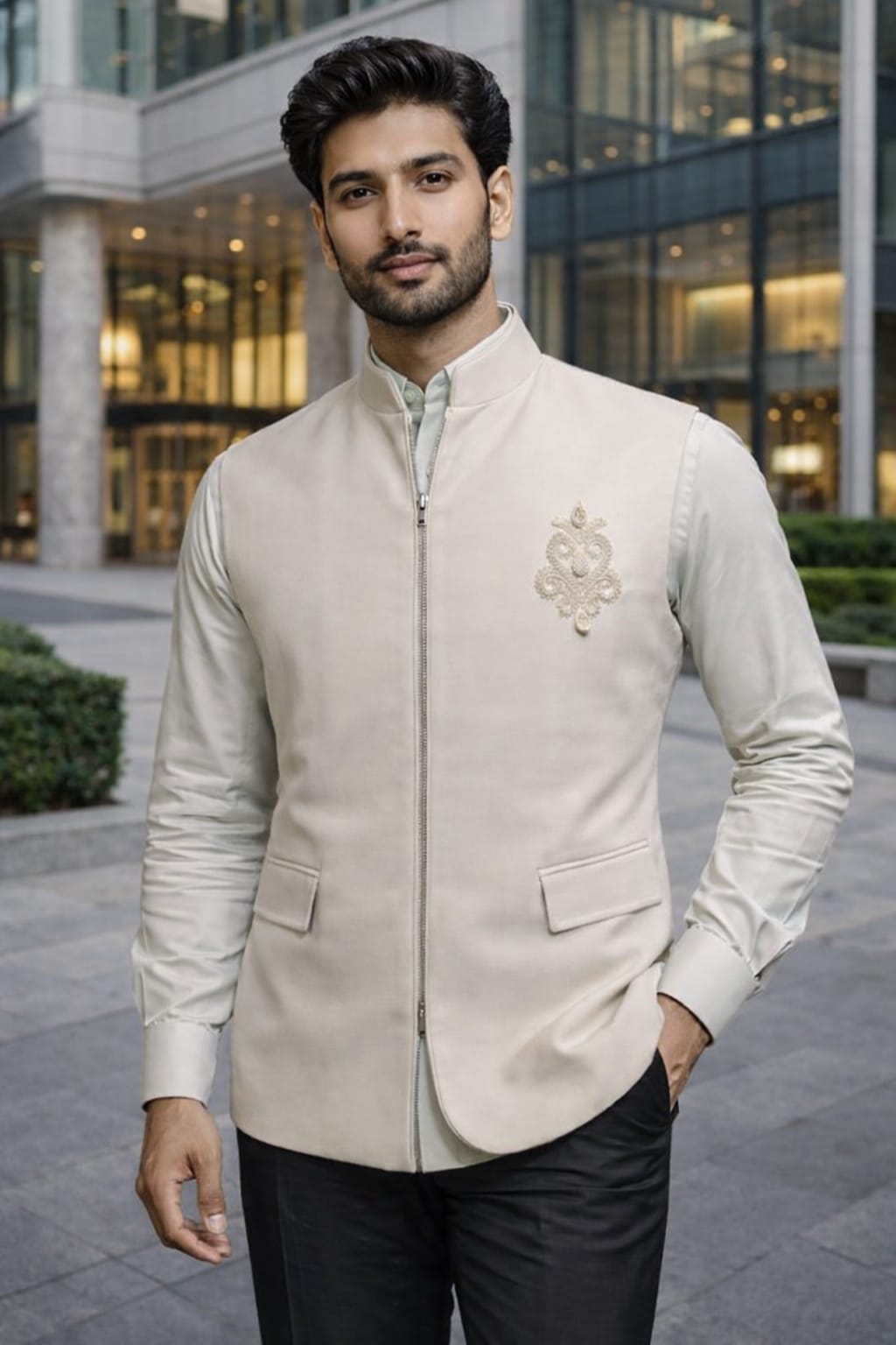 An elegant ivory kurta set paired with a beautifully embroidered Nehru jacket