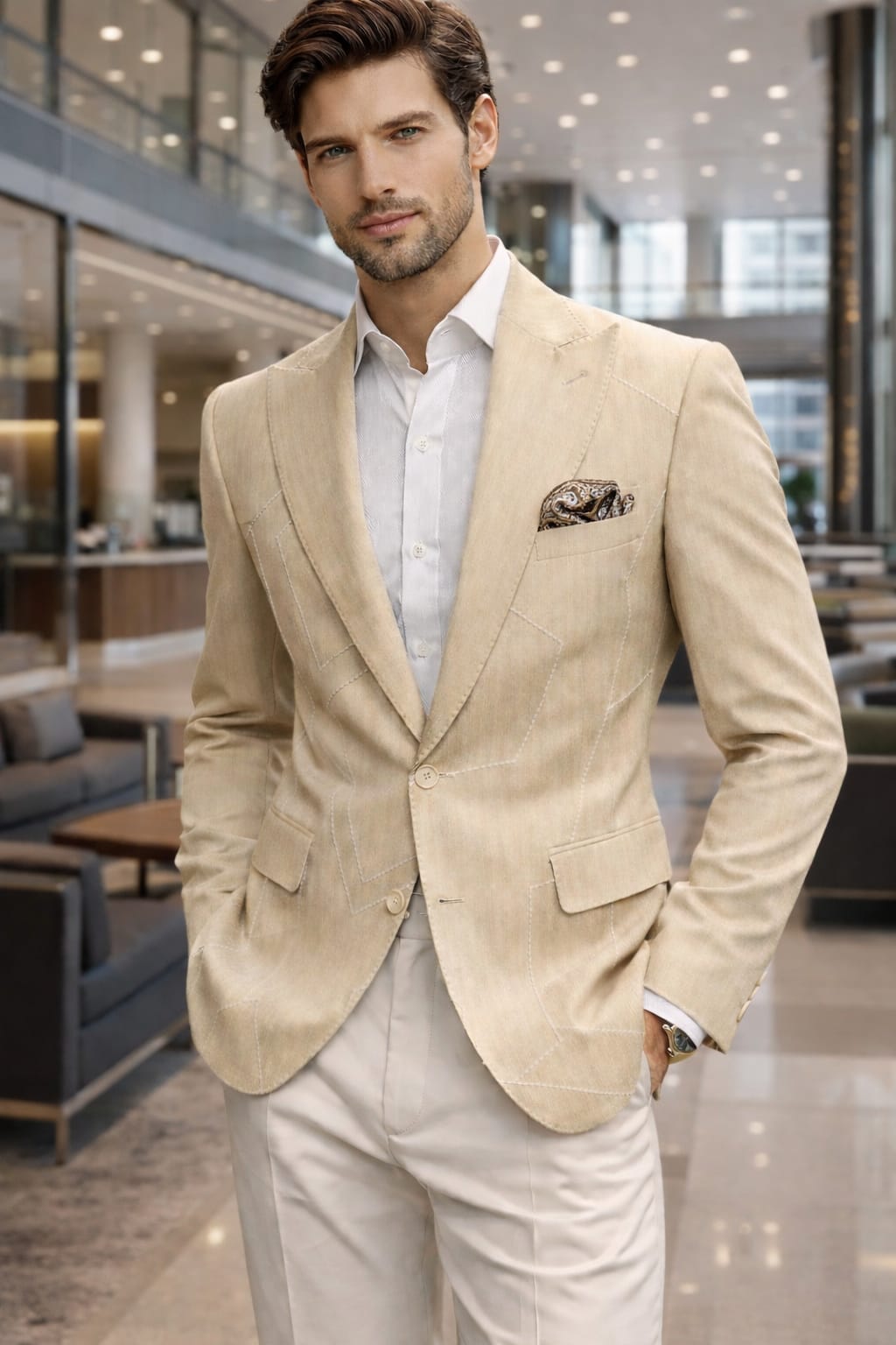 A royal beige bandhgala suit set with elegant shoulder detailing, metal buttons, and a sharp tailored fit
