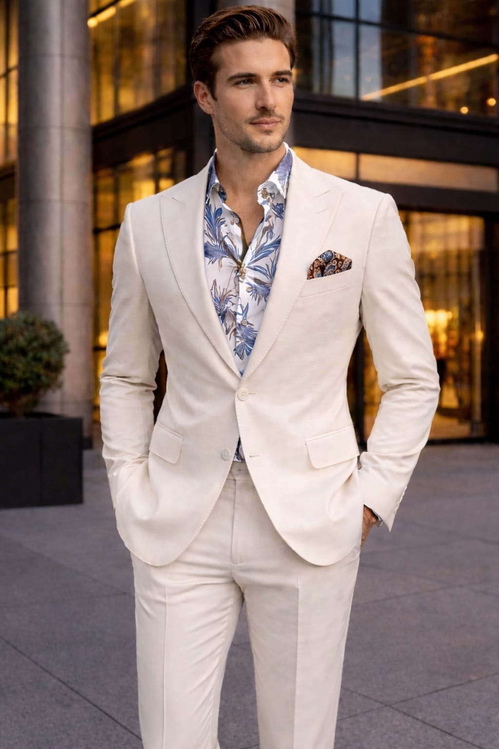 A royal cream bandhgala suit set with elegant metal buttons and a sharp tailored fit