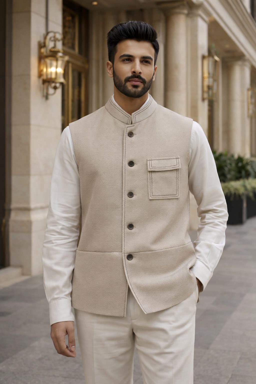 A royal beige bandhgala suit set with elegant shoulder detailing, metal buttons, and a sharp tailored fit