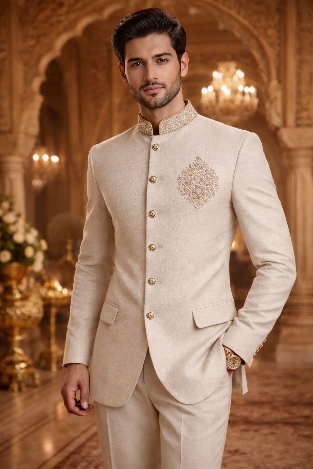 A royal cream bandhgala suit set with elegant metal buttons and a sharp tailored fit