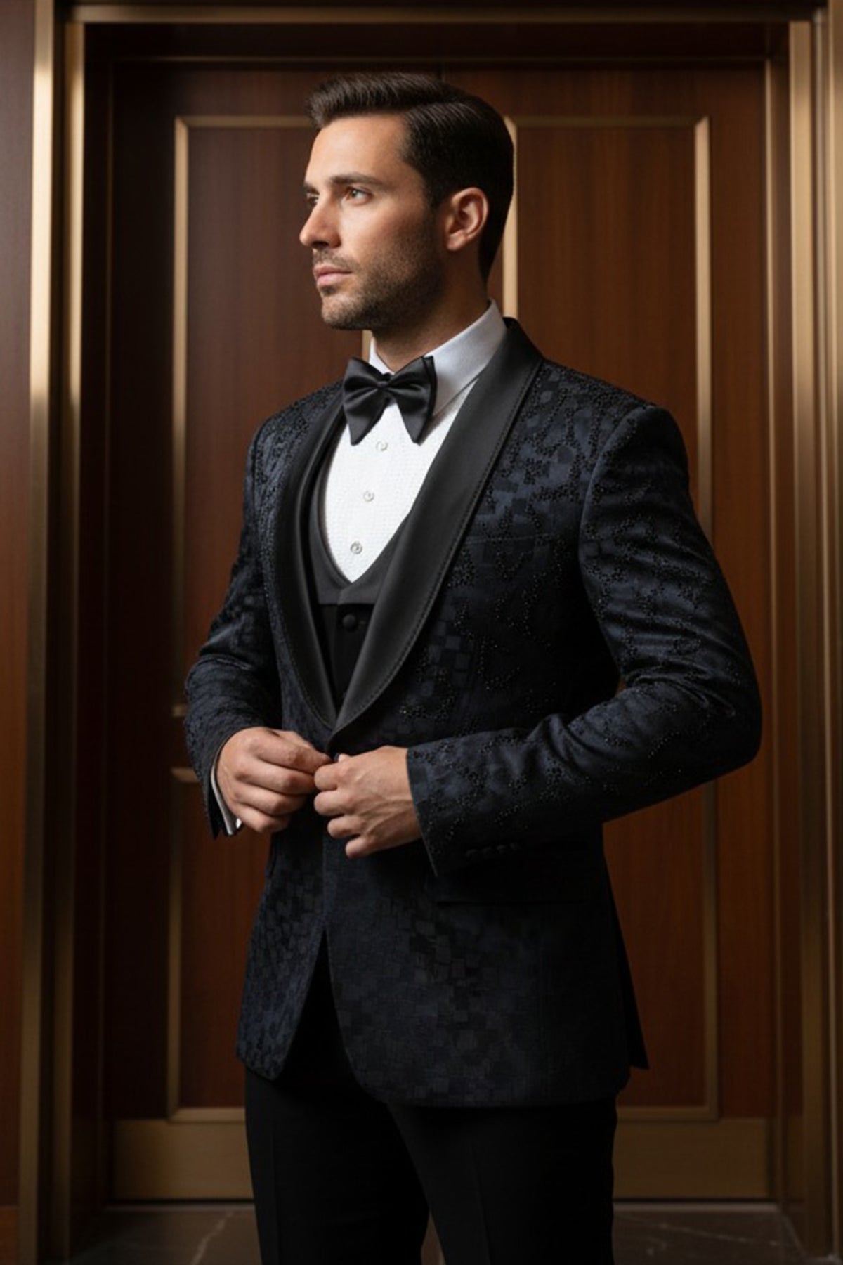 The Obsidian Mosaic Tuxedo Set is a seamless blend of geometric modernity and timeless elegance. Featuring a sleek, patterned fabric with subtle tonal contrasts, the jacket’s mosaic-inspired texture lends a bold yet sophisticated character. Accentuated with a satin shawl lapel and paired with classic black trousers, this ensemble strikes the perfect balance between contemporary edge and formal finesse—ideal for the discerning gentleman who values both artistry and precision in his attire. Style it on wedding reception and cocktail events, sangeet night and carnival.