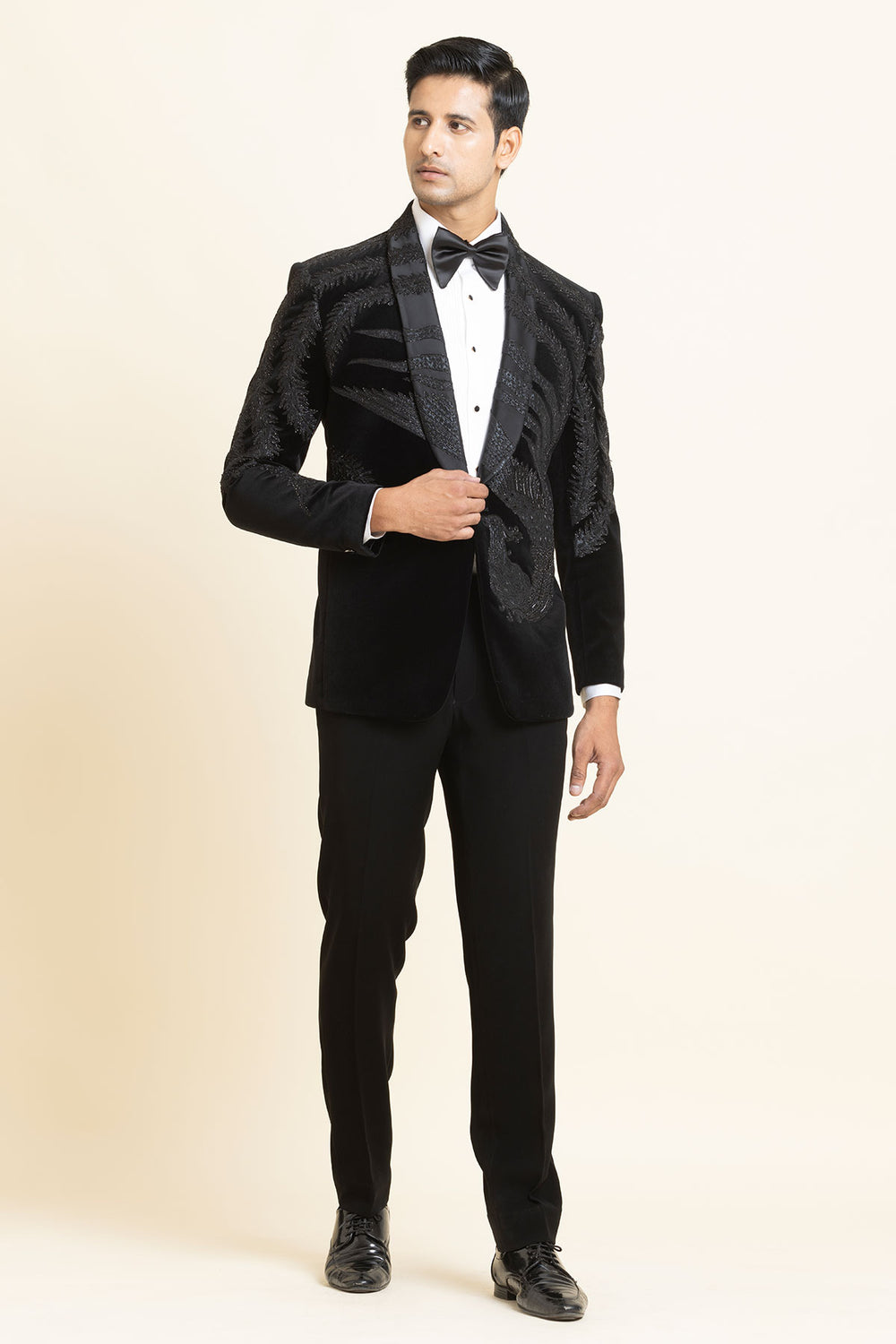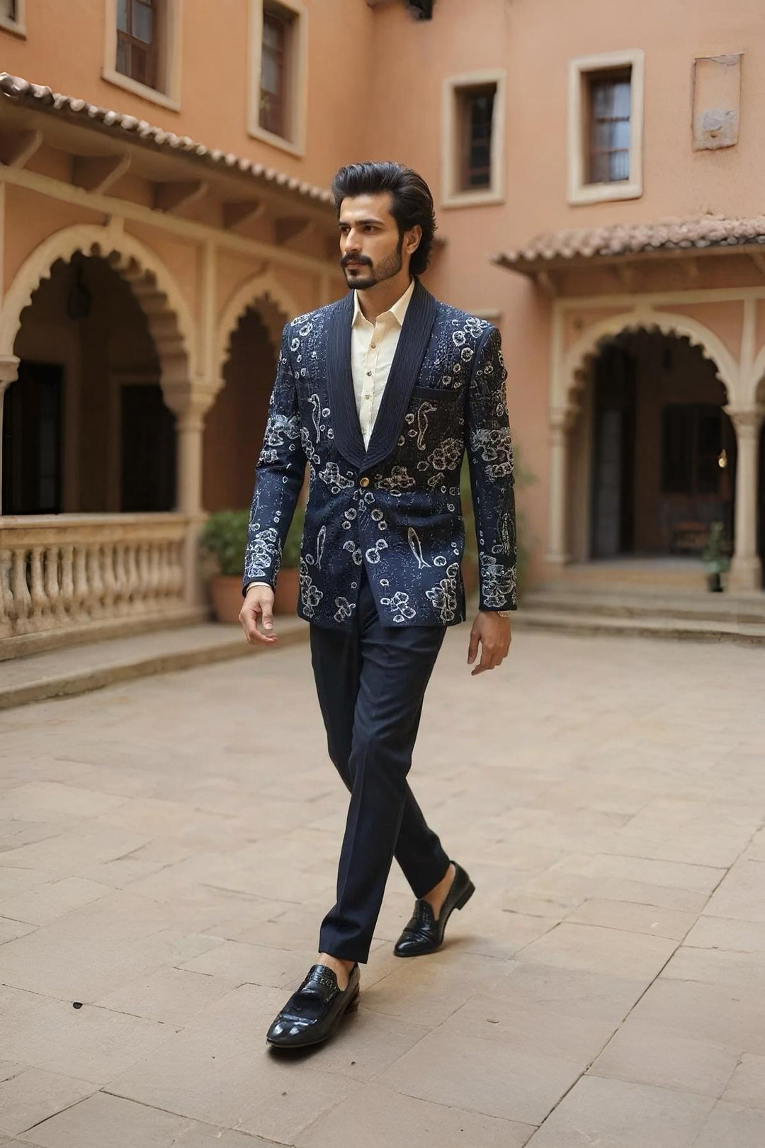 Opulent Midnight Blue Velvet Tuxedo with Hand Embroidered Detailing